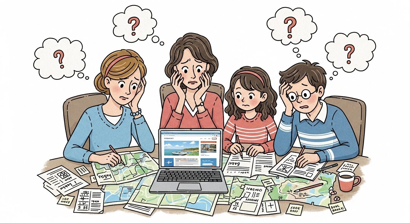 40代の家族旅行は、独身時代や夫婦だけの旅行とは違う、特有の難しさがありますよね。まずは、多くのパパ・ママが直面する「計画段階の壁」に共感するところから始めましょう。