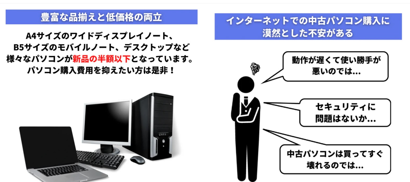 A: サイトには様々な種類のパソコンが掲載されています。お客様の用途やご予算に合わせて、最適な一台を見つけるお手伝いをさせていただきます。お気軽にお問い合わせください。