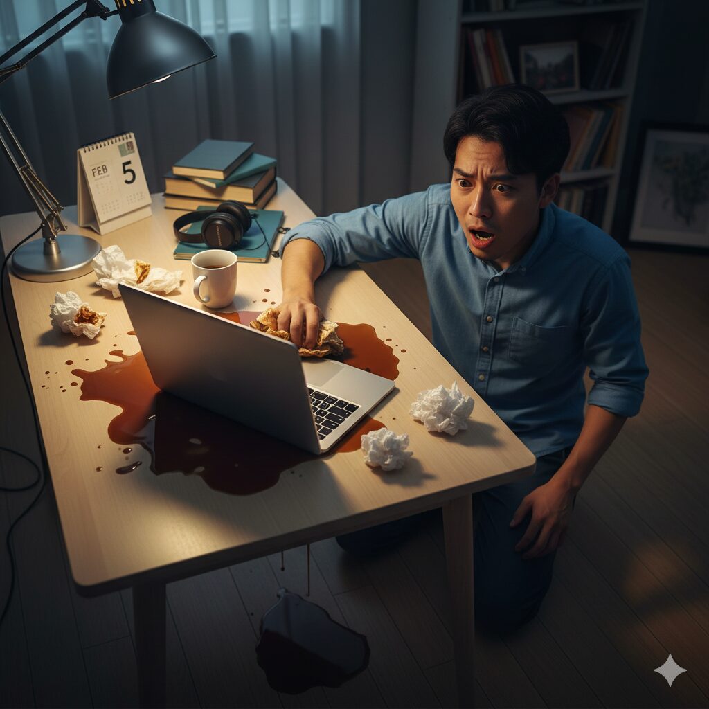 重要なプレゼン資料を作成していた朝、手元が狂ってコーヒーをノートPCにぶちまけてしまいました。